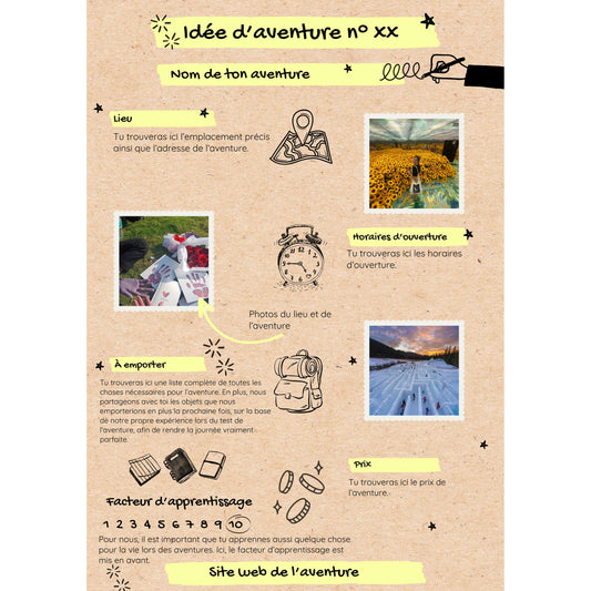 Nous tenons à ce que chaque famille, quel que soit son budget, puisse passer du temps de qualité ensemble. Nos aventures sont spécialement conçues pour éloigner les enfants des écrans et les rapprocher d’expériences réelles.